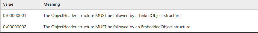 The class name field is also quite interesting, it contains the name " OLE2Link" which might give us a few hints about what this OLE Object is meant to do. Finally, after the ObjectHeader we have the value contained in offset 0x1D which is 0x0000A000 which represents the entire stream size of this object. This value is quite important as modifying the OLE Object would require altering this value as well, otherwise the Word process won't read the OLE Object in its entirety.