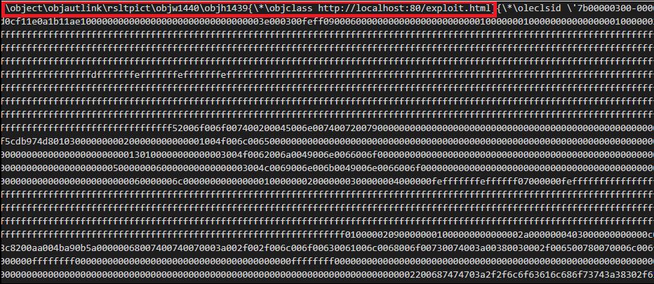 If we take a simple look at how an RTF file can be loaded with a malicious hyperlink we can as specified in this article regarding cve-2017-0199 we can see that -