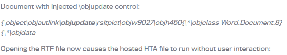 The fields of interest are \objautlink which specifies an auto link object which is essentially a link within the word document that auto executes. According to the RTF specifications the \objupdate should execute it by force but from my own testing this works in an arbitrary way. Finally, the most interesting field is \objdata.