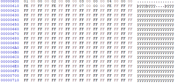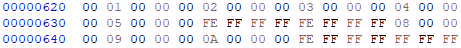 The next sector specifies the MiniFAT chain which give information regarding the chained streams within the CFB. Its not a very important sector for the blog but its worthwhile to see how it looks. The chain shows how the streams are linked. Each cell in the chain represents 40 bytes of a stream, it continues up until it reaches the value 0xFFFFFFFE so the first stream goes for 5 blocks of 40 bytes (or 0x140 in hex).