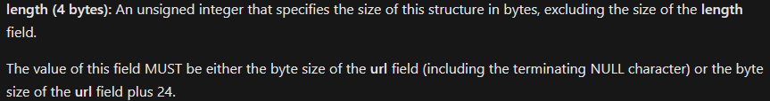 URLMoniker length – This field specifies the byte size of the URI string plus 24(really, it's weird I know - but its specified in the URLMoniker specification)