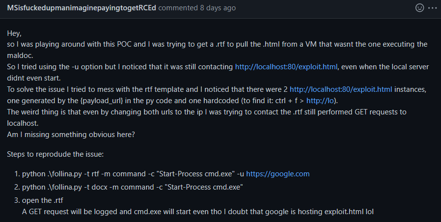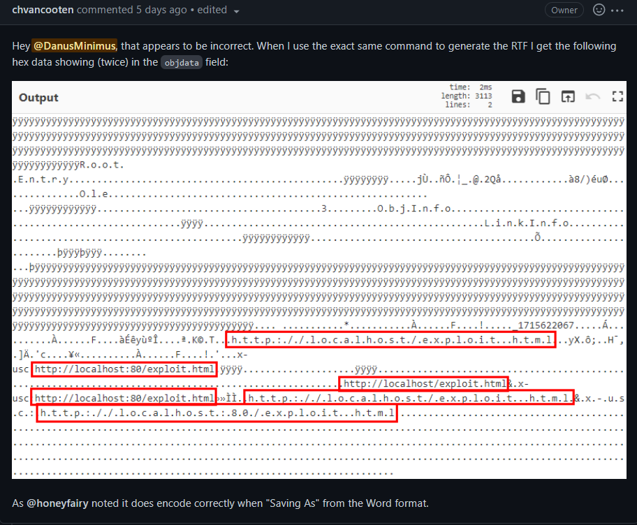 This was right, as long as the last field – objdata – was loaded with a proper OLE object. Honestly this assumption that I had initially about this implementation was due to my laziness and wishful thinking (Actually assuming that implementing this within Windows would be THAT easy and not convoluted). This error, which was totally missed by me as I did not test the POC properly, prompted a person with a very creative user handle to raise an issue on github for Cas's POC, this issue was raised regarding RTF generation feature I contributed.