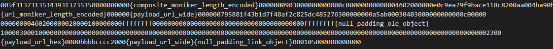 The first problem that needs addressing is the total size of the streams, while I can manually adjust the CFB file myself a much easier solution would be to just generate a very large OLE stream. I just input a different sized port with the value of 65535 instead of the default 80 using Cas Van Cootens POC code for Follina that was mentioned in the beginning of the blog and this in turn generates a very large stream. This time the NativeDataSize contains the value 0xC00, which is 512 bytes larger than previously (just one sector larger).